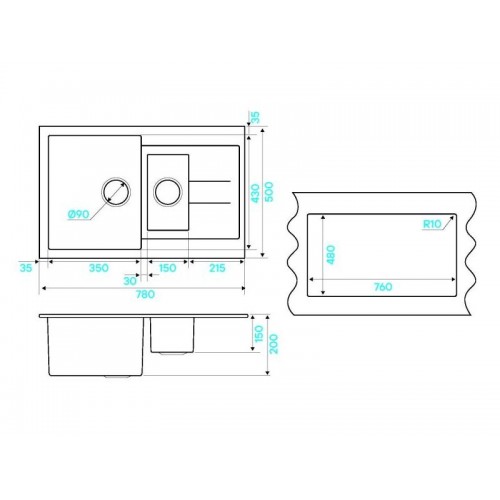 Размер мойки - 780х500х200мм