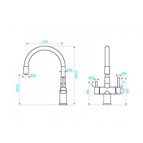 Смеситель KÜCHENSTERN BRUNN-FE объединяет сразу две функции - питьевая и обычная вода из одного смесителя. Смесителем удобно пользоваться , так как он имеет два отдельных рычага управления для водопроводной и фильтрованной воды, а также переключается на режим "Душ".