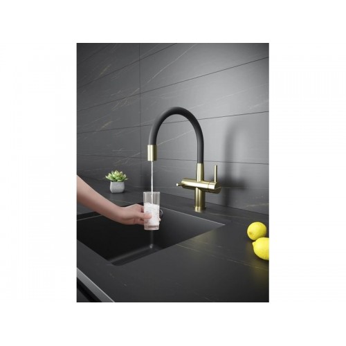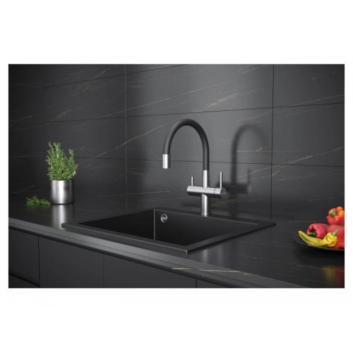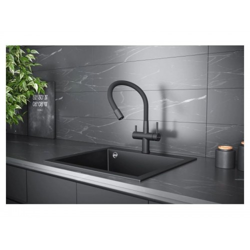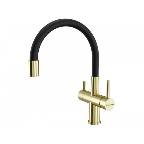Смеситель KÜCHENSTERN BRUNN-FE объединяет сразу две функции - питьевая и обычная вода из одного смесителя. Смесителем удобно пользоваться , так как он имеет два отдельных рычага управления для водопроводной и фильтрованной воды, а также переключается на режим "Душ".