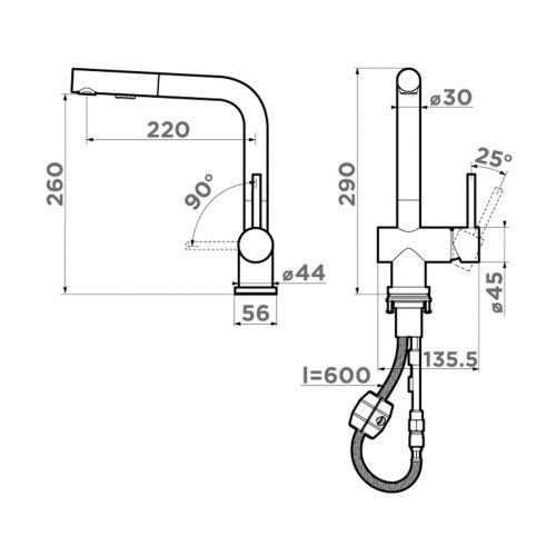 Особенности: угол поворота ручки может отличаться в зависимости от партии, вытяжной шланг до 600 мм