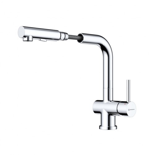 Практичный однорычажный смеситель выполнен в современном стиле и снабжен высоким поворотным изливом и вытяжным шлангом.