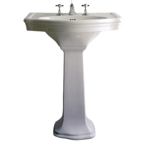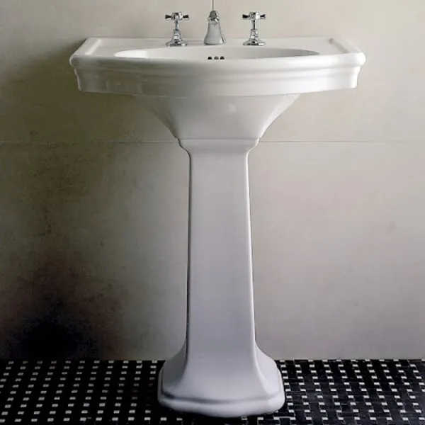 Белоснежная раковина на пьедестале имеет строгие линии, современный дизайн и высокие эксплуатационные качества. Раковина выпускается из санфаянса с тремя, а также одним отверстием под смеситель. Можно заказать данную модель в черном цвете. Параметры сантехнического оборудования 71х53х86 см.