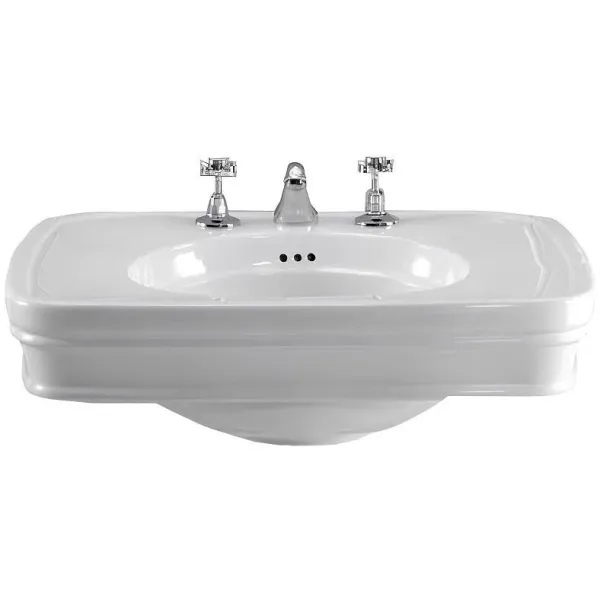 Красивая санфаянсовая раковина устанавливается с использованием пьедестала. Модель рассчитана для просторных ванных комнат, так как имеет размер 70х56х87 см. Раковина прямоугольной формы выпускается с одним и тремя отверстиями для смесителя. Пьедестал прочный, устойчивый, создан в классической форме.