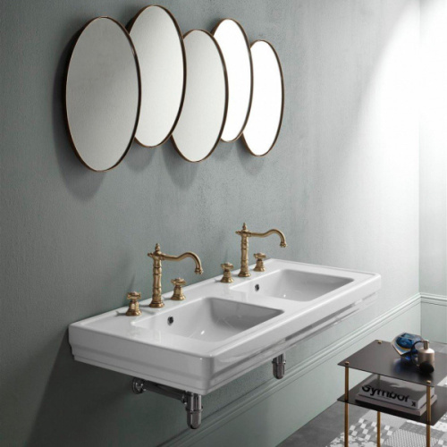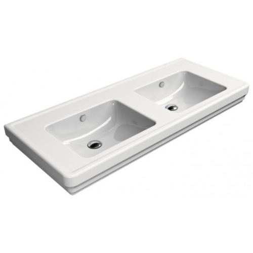 Раковина двойная GSI Classic выполнена из керамики в белом цвете. Модель имеет прямоугольную форму, предусматривает установку двух смесителей на бортик перед каждой чашей. С обеих сторон раковины крепятся полотенцедержатели из хромированного металла. Оборудование простое в уходе, долго служит.