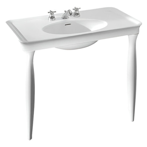 Раковина Hatria Dolcevita имеет прямоугольную форму и овальное углубление, устанавливается при помощи двух изящных ножек. Оборудование выполняется из качественного санфаянса в идеальном белом цвете. Есть место для удобного расположения аксессуаров. Глянцевая поверхность раковины легко моется.