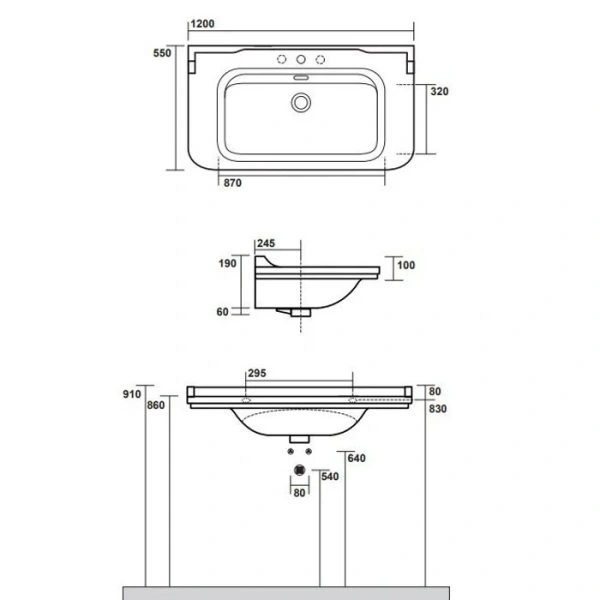 Раковина Kerasan Waldorf 120 см c 3 отверстиями под смеситель 4144K1bi/cr*3