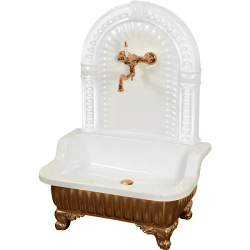 Напольная раковина Migliore Olivia Zampa в сочетании белого и бронзы — это элегантное решение для классического интерьера. Ножки в форме лап и бронзовые акценты придают изделию роскошный вид. Изготовленная из прочного стеклокомпозита с глянцевой поверхностью, она сочетает в себе стиль и долговечность. Пристенная панель имеет 2 готовых отверстия под смеситель, который удобно размещается на панели. Внутренняя глубина 13 см обеспечивает комфортное использование, а отсутствие отверстия для перелива поддерживает минималистичный дизайн.