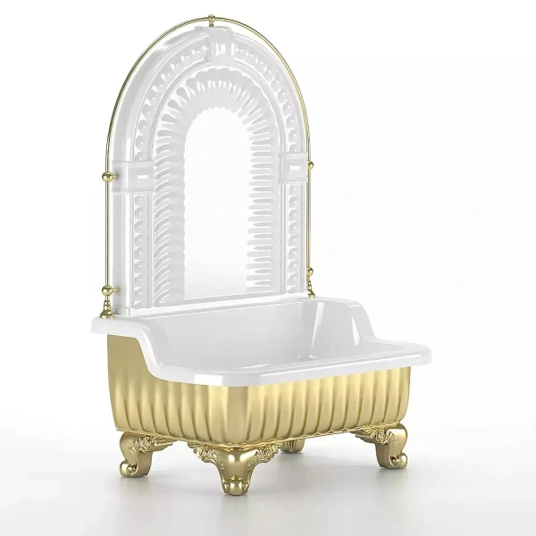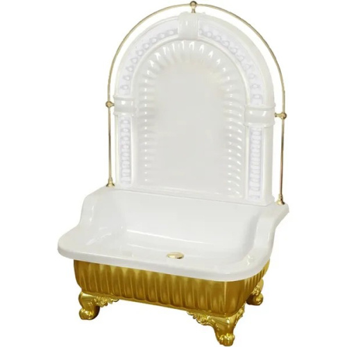 Напольная раковина Migliore Olivia Zampa с галереей в золотом цвете — это сочетание изысканности и элегантности. Бело-золотая палитра придаёт изделию особый шарм, идеально вписываясь в роскошный интерьер. Изготовленная из прочного стеклокомпозита с глянцевой поверхностью, она обладает высокой долговечностью. Пристенная панель упрощает установку, а внутренняя глубина 13 см обеспечивает комфортное использование. Без отверстий для смесителя и перелива, раковина выглядит максимально утончённо.