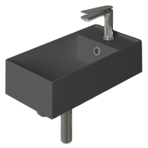 Simas Agile — элегантная антрацитовая матовая раковина размером 50 см. Одно готовое отверстие для смесителя и правое размещение делают её удобной в использовании. Отверстие перелива предусмотрено, а донный клапан приобретается отдельно. Весит 11,5 кг и имеет универсальный диаметр сливного отверстия — 50 мм.