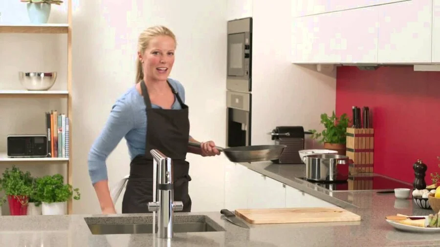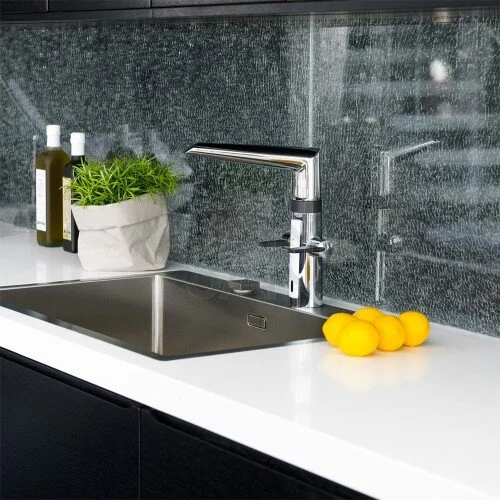 Смеситель для кухни с удобными рукоятками для горячей и холодной воды, бесконтактной функцией, высоким поворотным изливом и аэратором. Расход горячей и холодной воды регулируется отдельными рукоятками. Угол поворота извива составляет 120° (заводская установка). По желанию поворот излива может быть ограничен до 60° или 80°. Для активации бесконтактной подачи воды поднесите руки к датчику. Температура воды при бесконтактной работе регулируется поворотом кольца между смесителем и изливом. Бесконтактная функция легко включается/ выключается. Работает от батареи 3 В. Смеситель оснащен грязевыми фильтрами.