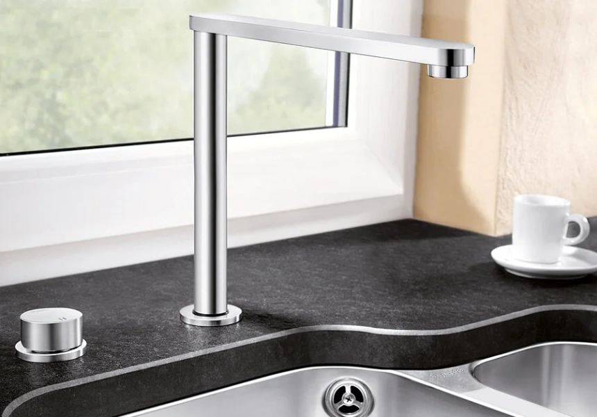 Смеситель для кухни Blanco Eloscope-F II 516672 выглядит очень оригинально. Он монтируется на два отверстия: одно под Г-образный кран, второе под отдельный рычаг управления.