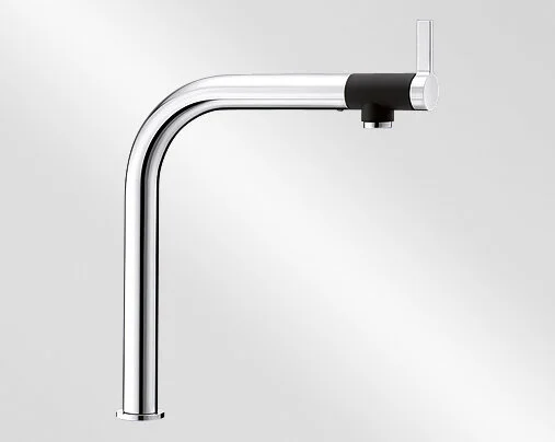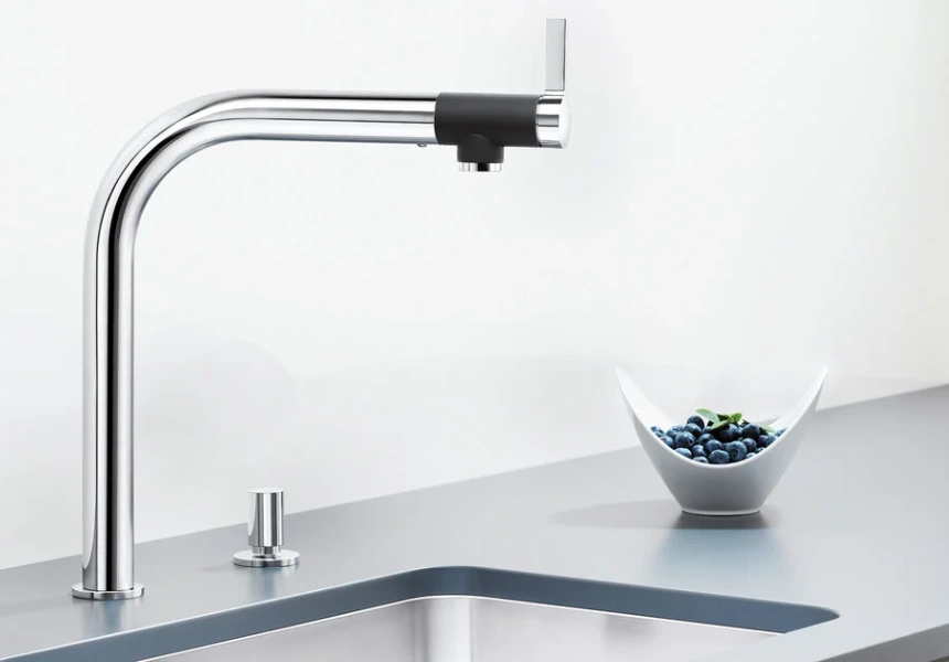 Смеситель для кухонной мойки Blanco Vonda смотрится оригинально за счет того, что рычаг управления находится на конце излива.
