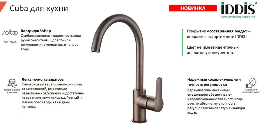 Смеситель для кухни IDDIS Cuba CU3MBJ0i05 в цвете состаренной меди с матовой поверхностью — стильное решение для интерьера. Излив 18.35 см, высота 23.5 см. Оснащен керамическим картриджем 35 мм и силиконовым аэратором Neoperl M22 с функцией легкой очистки и снижения шума. Гибкая подводка из нетоксичной EPDM резины в оплетке из нержавеющей стали (длина 550 мм). Экономит расход воды. Предназначен для бытового использования.