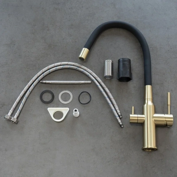 Смеситель для кухни Lemark Expert LM5083LGN-Black — стильное и функциональное решение для вашей кухни. Золотистый цвет в комбинации с черным придаёт изделию элегантность, а металлические рукоятки обеспечивают удобство использования. Для крана с питьевой водой предусмотрена керамическая кран-букса с углом поворота 90°. Комбинированный аэратор Neoperl Perlator Flow Thru позволяет использовать водопроводную и питьевую воду.