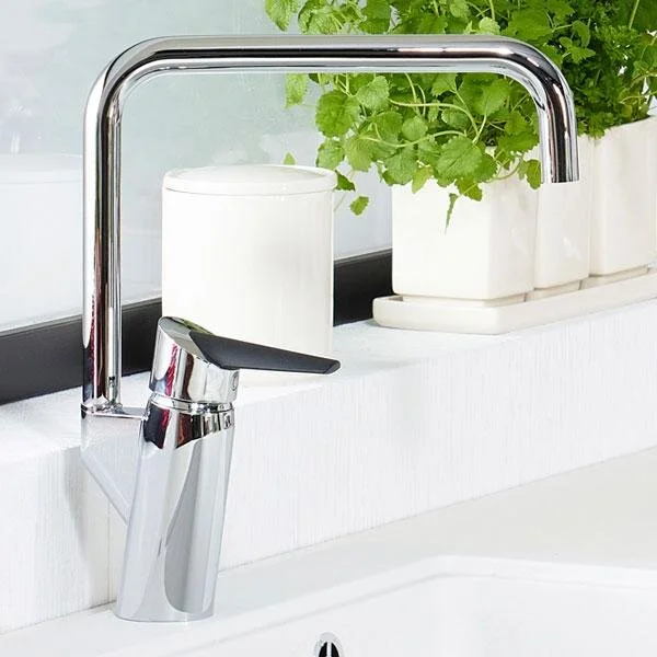 Смеситель для кухни с удобной рукояткой, высоким поворотным изливом и аэратором. Угол поворота извива составляет 120° (заводская установка). По желанию поворот излива может быть ограничен от 0° до 60°. Все материалы, контактирующие с водой, не содержат свинца.