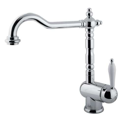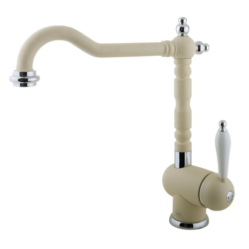 Смеситель для кухни Timo Morea 2406F – изящная, стилизованная под старину модель с однорычажным управлением. Излив – длинный (27,5 см), слегка изогнутый, поворотный. Керамическая ручка расположена сбоку. Корпус производится из латуни с покрытием в нескольких расцветках: бронза, шампань, жасмин, антрацит, хром, сэнди (песочный), черный и белый. Поверхность может быть глянцевой или матовой. Модель предназначена для раковины на оформленной в ретро-стилистике кухне. Монтируется в одно отверстие на мойку или столешницу.
