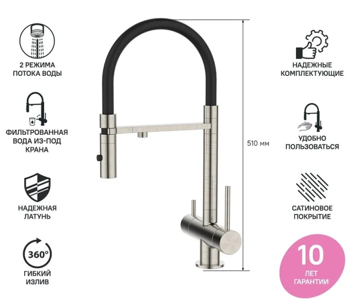 | Тип излива | С поворотным изливом, С длинным изливом, С гибким изливом |