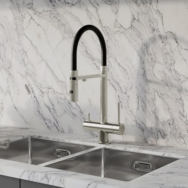 Смеситель для питьевой воды IDDIS Ace ACEBNFFi05 с матовым PVD-покрытием и гибким силиконовым изливом в цвете сатин сочетает стиль и функциональность. Высота излива — 18 см, длина — 20 см. Оборудован двухрежимным аэратором Neoperl M24 и керамическим картриджем 35 мм. Питьевая вода подаётся через отдельный излив с независимым рычагом. Подключение — гибкая подводка из EPDM-резины в оплётке из нержавеющей стали. Подходит для бытового использования.
