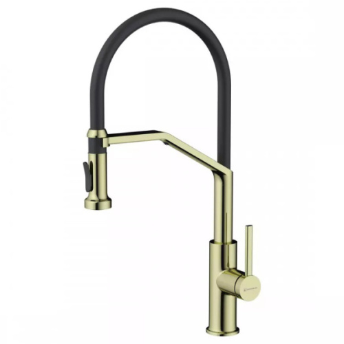Смеситель для питьевой воды Omoikiri Makkari 2 Plus-SB LG-BL 4994496 в цвете светлое золото/черный — стильное и функциональное решение для кухни. Совмещённый излив подаёт обычную и питьевую воду, управление осуществляется одним боковым рычагом. Излив высотой 23 см и длиной 23,5 см вращается на 360°. Имеется режим душа. Матовая и глянцевая поверхность. Керамический картридж 35 мм, гибкая подводка в оплётке из нержавеющей стали. Монтаж — через отверстие 35 мм.
