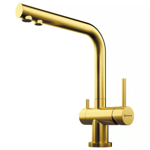 Смеситель для питьевой воды Omoikiri Nagano LG 4994178 в цвете светлого золота украсит любую кухню. Высокий излив 26,8 см с углом поворота 360° обеспечивает комфорт при использовании. Питьевая вода подаётся через отдельный излив с отдельным рычагом. Сбоку расположен рычаг смешивания. Керамический картридж 35 мм, глянцевая поверхность, пластиковый аэратор, гибкая подводка в оплётке из нержавеющей стали. Монтажное отверстие — 35 мм. Вытяжной шланг отсутствует.